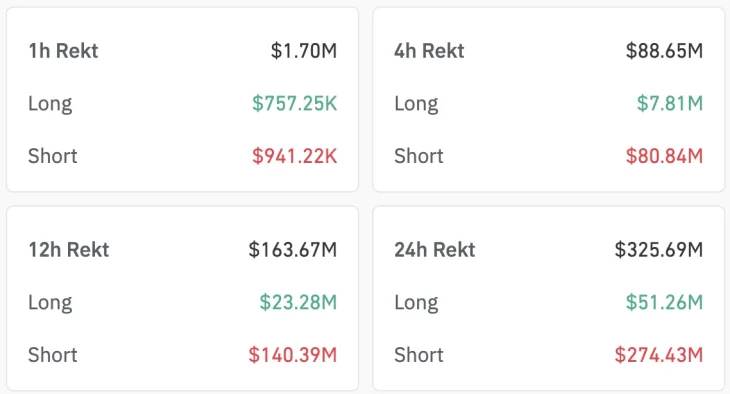 Son 24 saatte kripto para piyasalarında 324 milyon dolarlık tasfiye yaşanırken bunun 274 milyon dolarını short pozisyonlar oluşturdu.