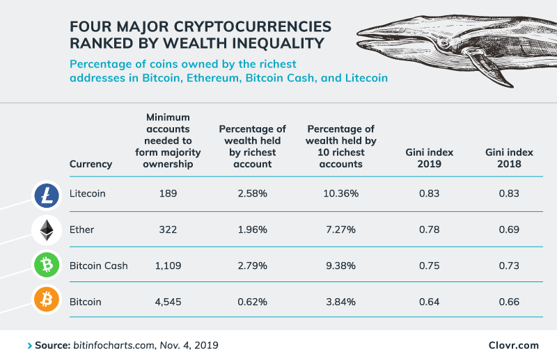 Clovr, her dijital para birimine ait en iyi 10.000 cüzdan adresini analiz ettiğini ve büyük borsa cüzdanlarını hariç tuttuğunu söylüyor. Araştırmaya göre, servet eşitsizliği büyük ERC-20 tokenleri için daha da ciddiydi.