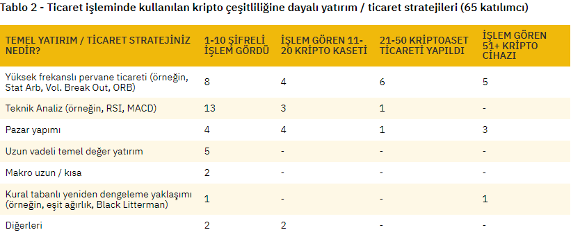 En yaygın olarak takip edilen üç yatırım stratejisi yüksek frekanslı ticari işlem (yüzde 35,5), teknik analiz (yüzde 25) ve piyasa yapıcı (maker) (yüzde 19,7).
