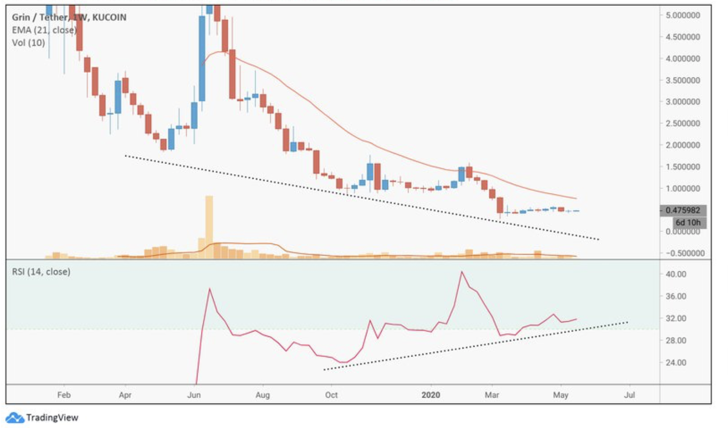 Halka açılması ile birlikte, her geçen gün metriklerinde azalma yaşanan kripto para, geçen yıl ise tamamen çöktü. Ancak haftalık GRIN/USD(T) grafiğine bakarsak, GRIN’de bazı hareketlenmelerin yaşandığını görebiliyoruz. RSI’da sürekli olarak düşen fiyat 0.50 dolar civarında bir zemin bulmuş olabilir ve bu seviyeden bir sıçrama yaşayabilir.