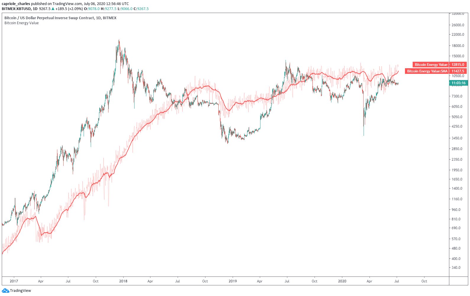 Grafik, Bitcoin’in fiyatının her zaman modelin üstünde ve altında ticaret yaparak enerji değeri ile bir şekilde ilişkili olduğunu göstermektedir.