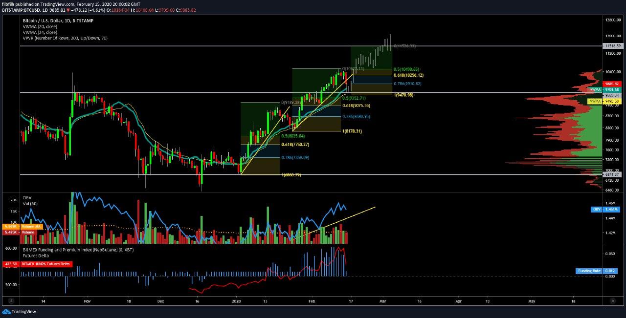 En büyük kripto para Bitcoin, 15 Şubat’ta günü güçlü bir düzeltme yaptı ve lider kripto para birimi 10.400 dolardan (bazı borsalarda) 9.700 dolara kadar geriledi. Bu düşüşle birlikte önde gelen kaldıraçlı borsalardan olan BitMEX’te dahil olmak üzere birçok borsada milyonlarca dolar değerinde long pozisyon tasfiye oldu.