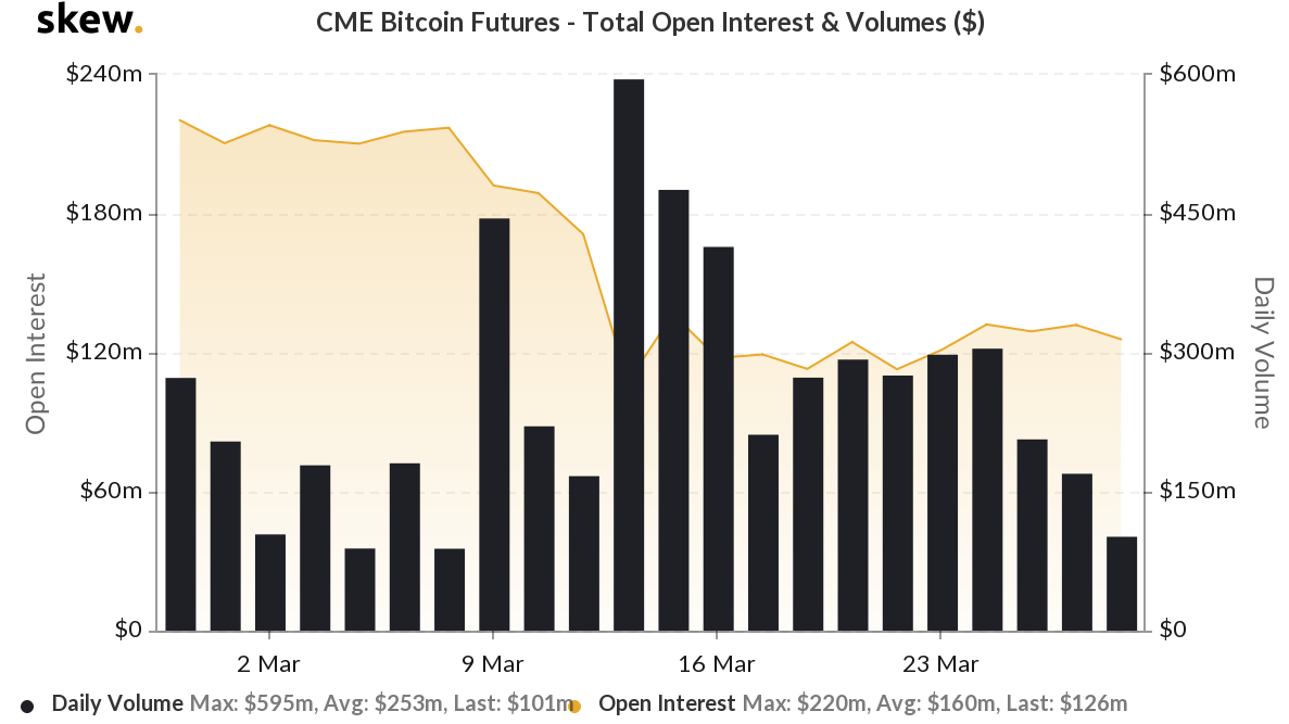 Skew verilerine göre, CME Bitcoin vadeli işlem piyasasının toplam günlük hacmi Mart ortasında 595 milyon dolardan 101 milyon dolara düştü.