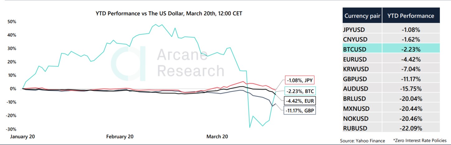 Her şeyi bir perspektife oturtmak gerekirse, Bitcoin, 2020’nin başından beri S&P 500, EUR/USD, GBP/USD, KRW/USD gibi paritelere kıyasla en güvenli yatırım aracı olmaya devam ediyor.