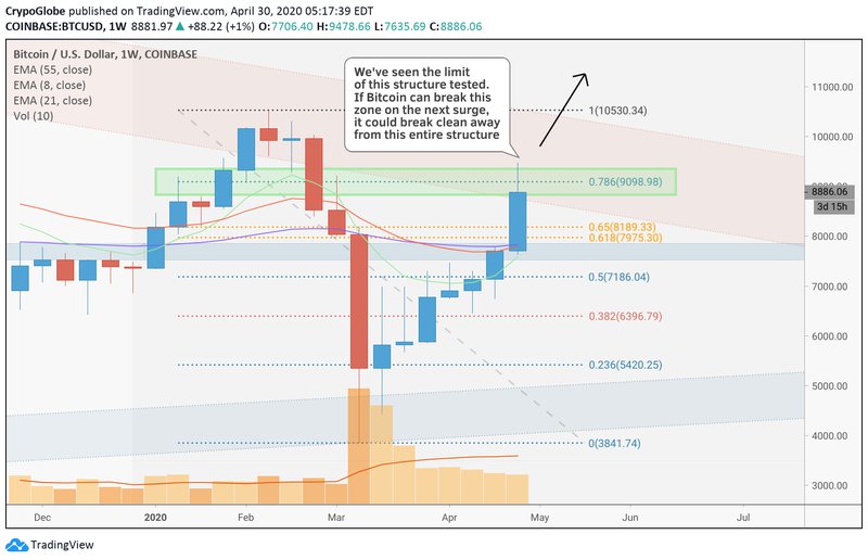 Son olarak haftalık grafikte, dünkü fiyat hareketinin en önemli sonucunu görüyoruz: Bitcoin fiyatı bölgesel pazar yapısının sınırı olan 786 fibonacci seviyesini geçti.
