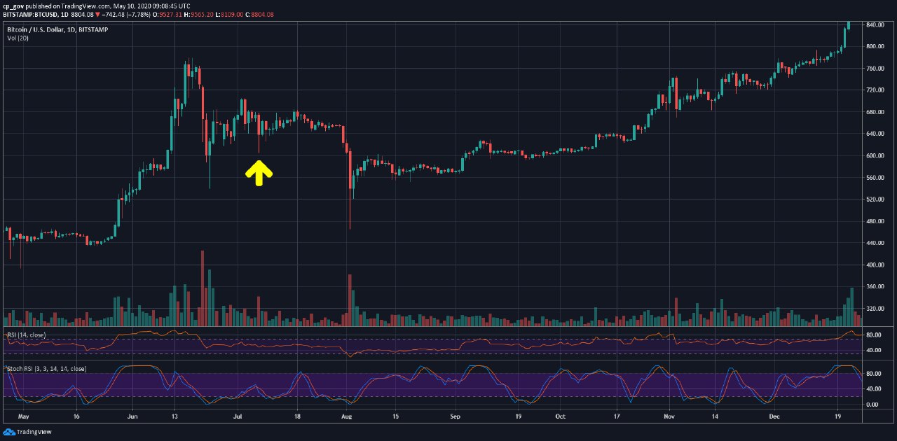 Benzer fiyat gelişmeleri yine 2. yarılanmadan iki gün önce, BTC’nin %11 düştüğü Temmuz 2016’da görülmüştü.