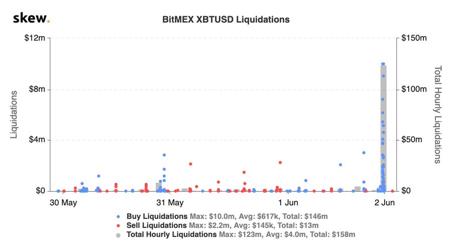 1 Haziran’da BTC, 9 bin dolarlık bölgedeki dirençlerini aştı ve 10.429 doların üzerine çıktı. Pazartesi gecesi neredeyse %8’lik bu artış, BTC türevleri piyasasında büyük bir faaliyet gördü. Blockchain analiz firması Skew’den alınan verilere göre, satın alma tasfiyesi BitMEX’te 130 milyon doları aşarak 2020 yılı içinde günlük en yüksek seviyeye ulaştı.