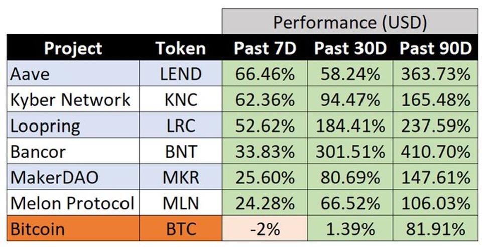 Aşağıdaki tabloda gösterildiği gibi, son haftalarda Bitcoin’den daha iyi performans gösteren DeFi tokenleri için çok farklı bir hikaye mevcut. Öyle ki CoinMarketCap sıralamasında ilk 100’de en iyi performans gösteren 10 kripto paranın 6’sı Defi kripto paralarıdır. Yine de bu DeFi yükselişi, Bitcoin’e daha fazla kazandırabilir.