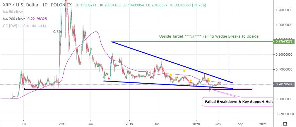 Ayrıntılı analizde Magic, XRP’nin Eylül 2017’den bu yana net bir düşüş içerisinde olduğunu söylüyor. Ek olarak analist, Mart ortasında gerçekleşen Coronavirus çöküşü sırasında bile XRP’nin, 0,12 – 0,15 dolar gibi önemli destek seviyesini koruduğunu belirtti. Aşağıda, Magic’in XRP analizinde kullandığı günlük grafiği bulunmaktadır.