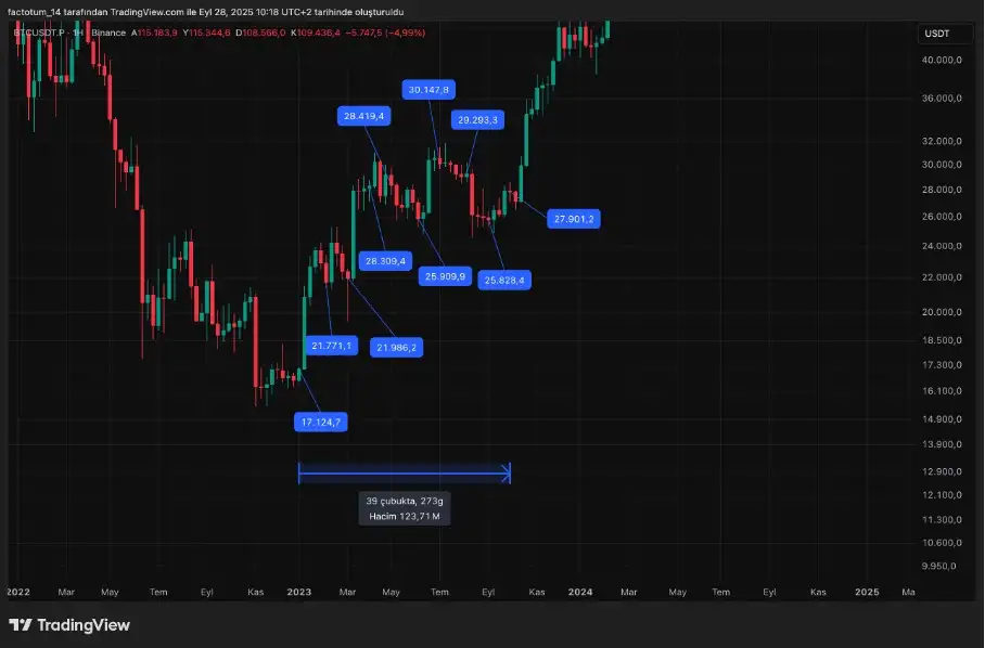 Eğer döngülere inanan birisiyseniz ve Bitcoin’in dört4 yıllık fiyat döngüsünü takip ediyorsanız 2 Ocak 2023 tarihinde başladığınız alımlarınızı muhtemelen 2025 ekim-kasım ayı dolaylarında satmanız gerekmektedir. Ekim ayının açılış fiyatının 113.988,7 dolar olduğu düşünüldüğünde kademeli bir şekilde alım yapmak dışında hiçbir şey yapmayarak 91.364,23 dolara ulaşarak toplam 71.364,23 dolar kâr elde edeceksiniz.