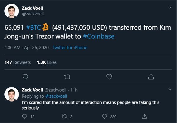 Aslında bu mesajlar Zack Voell’in Twitter’da paylaştığı şakaya gelen yanıtlardı. Kuzey Kore Lideri Kim Jong Un’un cüzdanından Bitcoin taşındığı haberi sadece bir şakadan ibaretti.