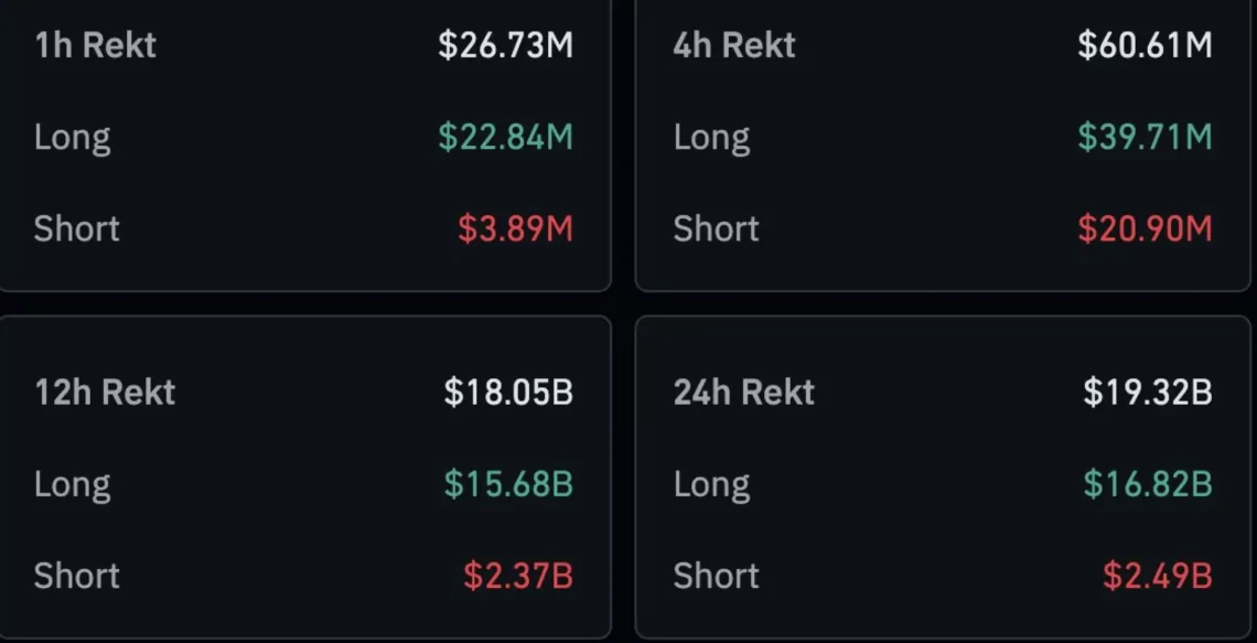 Spot piyasadaki ciddi kan kaybı vadeli piyasalarda kripto tarihinin en büyük tasfiyesine yol açtı. 19 milyar doları aşan tasfiyelerde long yani yukarı yönlü pozisyon açan trader’ların 16 milyar dolarlık pozisyonları tasfiye oldu ve 1,5 milyonun üzerinde trader saf dışı kaldı.